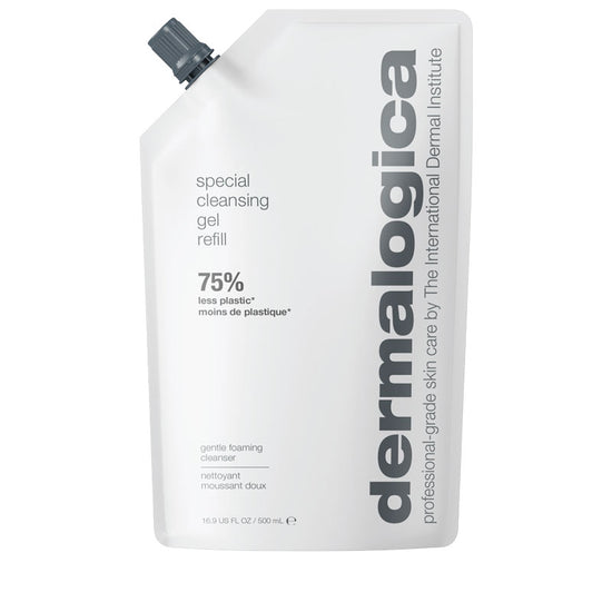 Reduce waste and refill with this refillable pouch of Dermalogica's top-selling cleanser, Special Cleansing Gel. Using much less plastic than a bottle, this refill pouch features a resealable spout for closure as well as for an easy pour into a bottle. Ideal to refill any size bottle, this flexible pouch is made of 75% less plastic than Dermalogica's original 500ml refill bottle and pump, making it the perfect option when its time to top-up your cleanser.