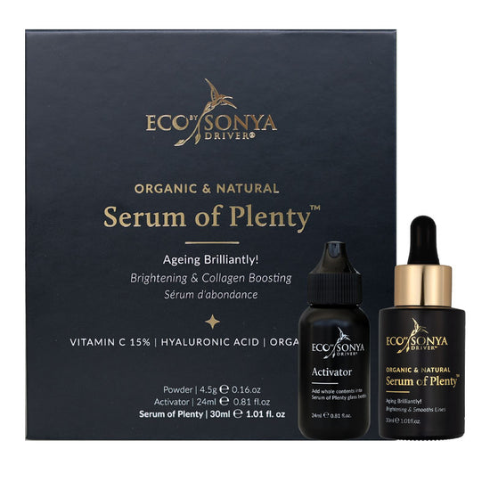 Introducing the Eco By Sonya Driver Serum of Plenty; a brilliantly formulated, best-selling treatment serum enriched with powerfully potent 15% Vitamin C, Organic Daisy, and skin-plumping Hyaluronic Acid. The perfect everyday serum for awakening the skin from dullness by targeting fine lines, hyper-pigmentation, stimulating collagen production, and brightening the skin. Ultimately, the skin is left with a glowing and rejuvenated complexion. Suitable for all skin types. Made with all-natural & organic ingredients.
