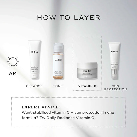 Harness the power of Medik8's original best-selling C-Tetra in a silky, nourishing cream. This daily antioxidant cream uses 100% stable vitamin C and vitamin E to prevent free radical damage. It's perfect for shielding the skin against environmental stressors, such as pollution and UV exposure, that cause premature skin ageing. The fast-absorbing formula helps to maintain skin health, improve uneven skin tone and restore radiance. Using a lipid-soluble form of vitamin C, tetrahexyldecyl ascorbate, the formula is able to deeply penetrate the skin, providing powerful antioxidant protection with minimal irritation. With uplifting natural citrus notes, C-Tetra energises skin while deeply hydrating for a bright, dewy complexion.