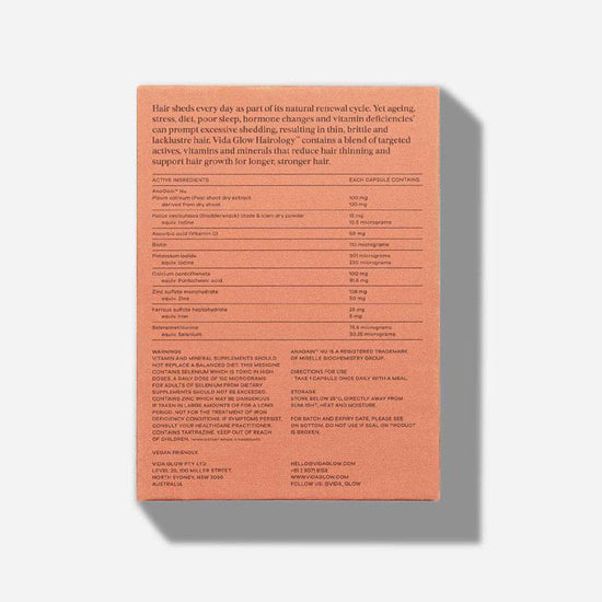 Hairology‚ is a once-daily ingestible capsule that helps reduce hair thinning and support hair growth. Targeting the cause of thinning lacklustre hair, Hairology‚ optimises the environment necessary for hair to grow and thrive. Powered by hero active, AnaGain‚, and a robust blend of targeted micronutrients, Hairology‚ supports and maintains healthy hair follicles to revitalise and strengthen strands from within. Tasteless and odourless, and easily integrated into your daily regime, Hairology‚ takes a multi-action approach to hair loss and growth, helping you achieve healthier, fuller-looking hair you can feel good about. Includes 30 vegan capsules.
